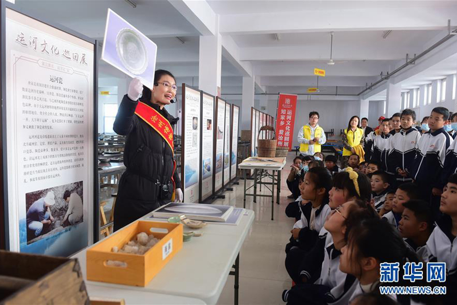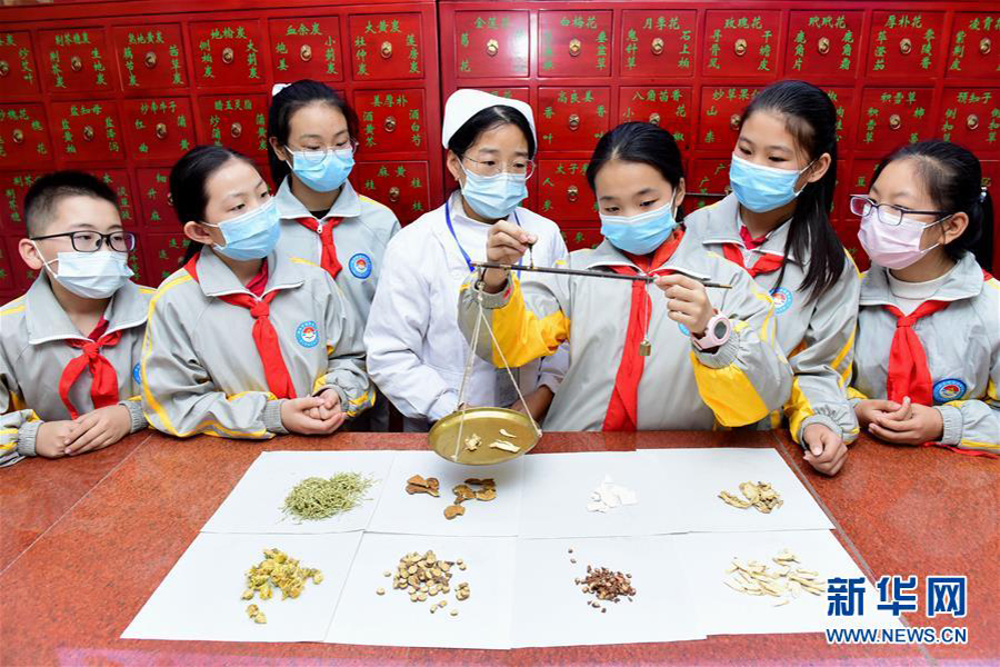 1/010月21日,山東省青州市東關(guān)回民初級(jí)中學(xué)的學(xué)生在藥劑師的指導(dǎo)下識(shí)別各類中藥材。(新華社發(fā) 王繼林/攝)