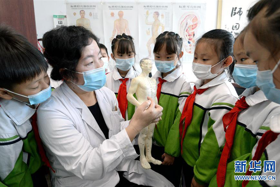 1/010月21日,河北省邯鄲市中醫(yī)院的醫(yī)務(wù)人員向叢臺(tái)小學(xué)的學(xué)生們介紹人體穴位知識(shí)。(新華社發(fā) 郝群英/攝)