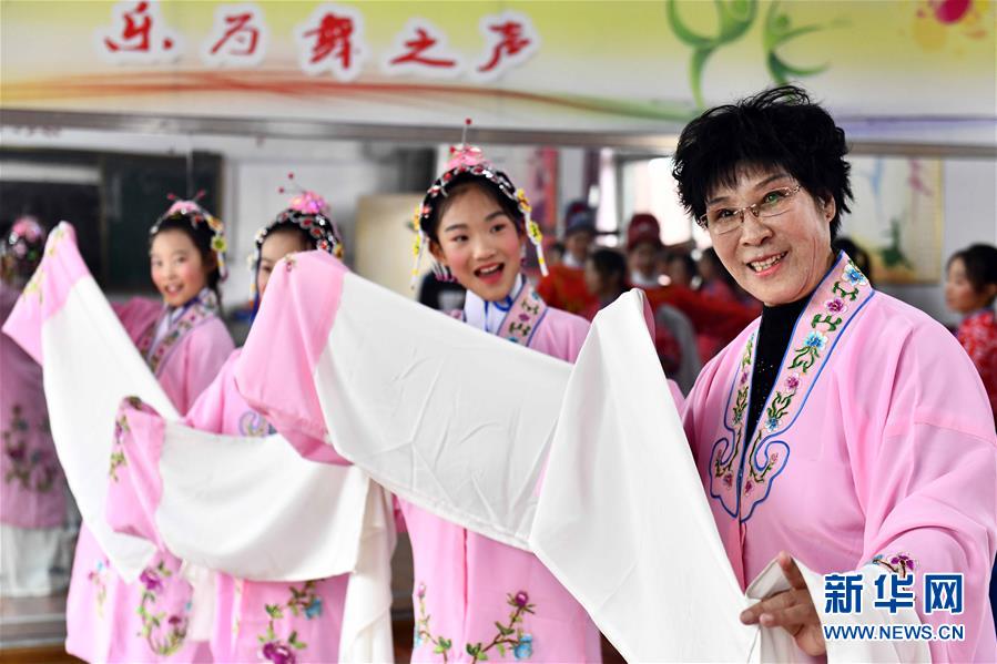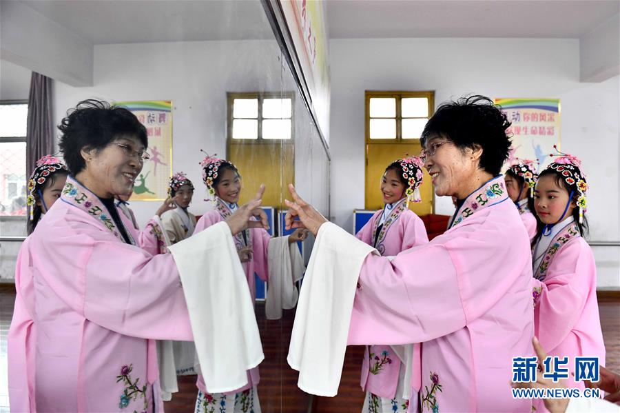 10月28日,在棗莊市臺兒莊區西關小學,文藝志愿者張鳳云在指導小學員練身段。(新華社記者 郭緒雷/攝)