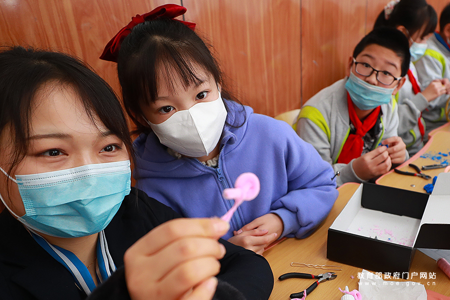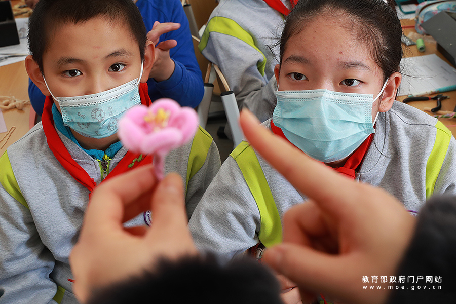 11月3日,北京昌平二中教育集團第二實驗小學六年級的學生圍著前來送教的老師討論絨花發簪的制作技巧。當天,昌平職業學校老師來到昌平二中教育集團第二實驗小學“送課上校”,完成小學6年級“紅外夜燈”和“絨花發簪”兩項課程的現場教學,以提升學生勞動技能水平,讓學生形成尊重勞動、珍惜勞動成果的良好風尚。(朱厚穎、張學軍/攝)