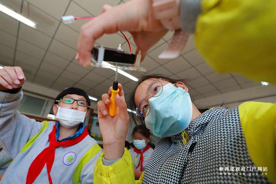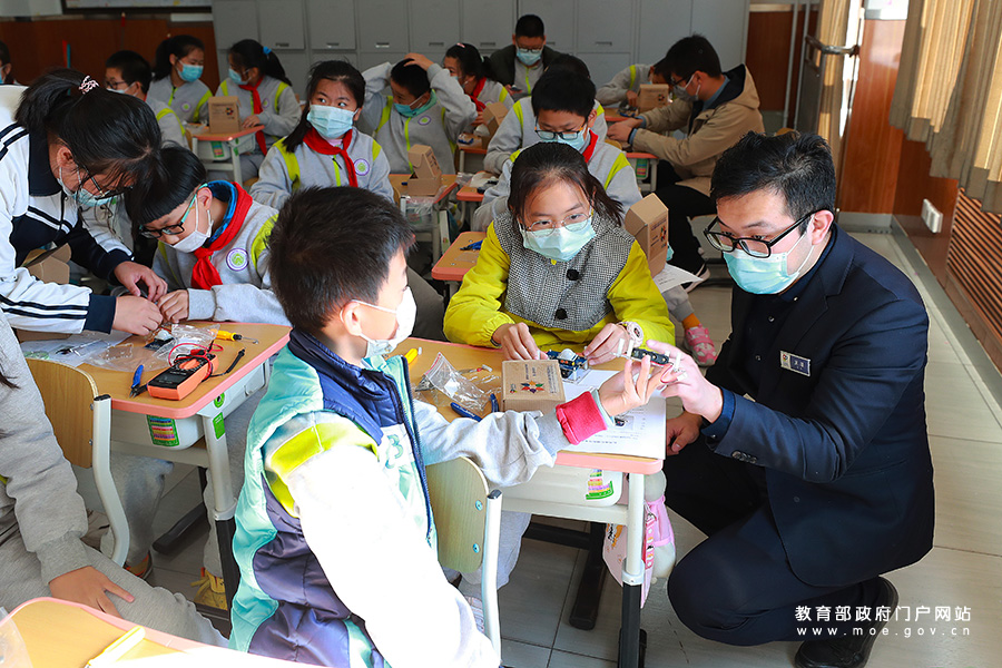 課堂上,老師正在指導學生組裝紅外夜燈。(朱厚穎、張學軍/攝)