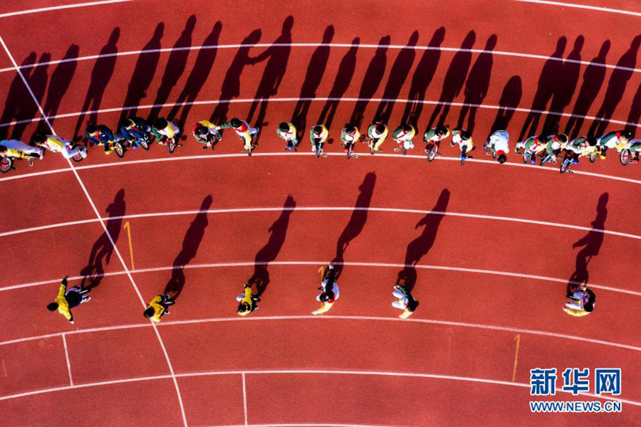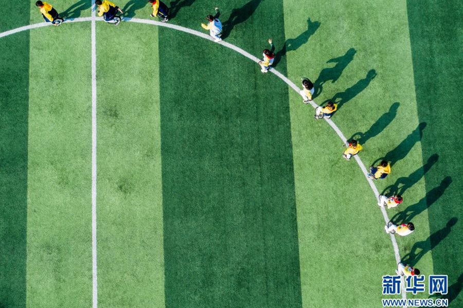 1/011月13日,在泗洪育才實(shí)驗(yàn)學(xué)校,學(xué)生在騎行獨(dú)輪車(無人機(jī)照片)。(新華社發(fā) 許昌亮/攝)