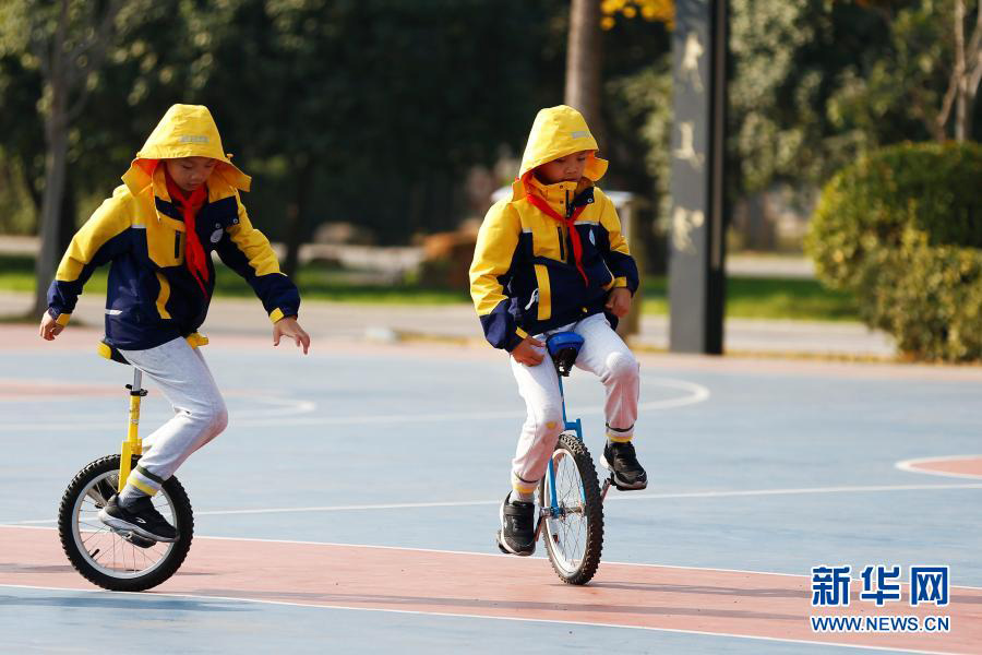 1/011月13日,在泗洪育才實(shí)驗(yàn)學(xué)校,學(xué)生在騎行獨(dú)輪車。(新華社發(fā) 許昌亮/攝)