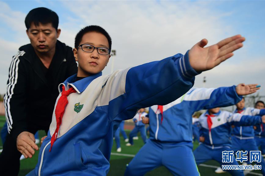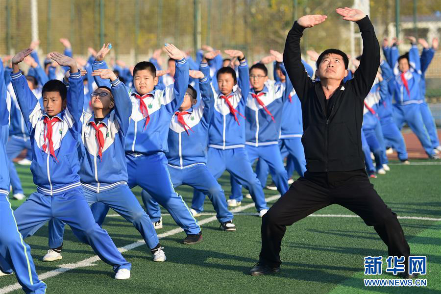11月19日,滄州青縣實驗小學的學生在體育老師的指導下練習盤古王拳。(新華社記者 王民/攝)