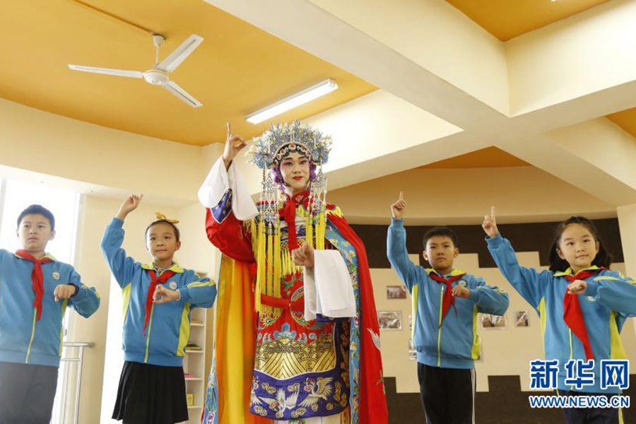 11月19日,在河北省邢臺市家樂園小學,戲曲教師指導孩子們練習戲曲。河北省邢臺市家樂園小學將傳統戲曲引進校園,通過戲曲學習、戲曲文化交流等形式,讓學生感受傳統文化的魅力。(新華社發 張馳/攝)