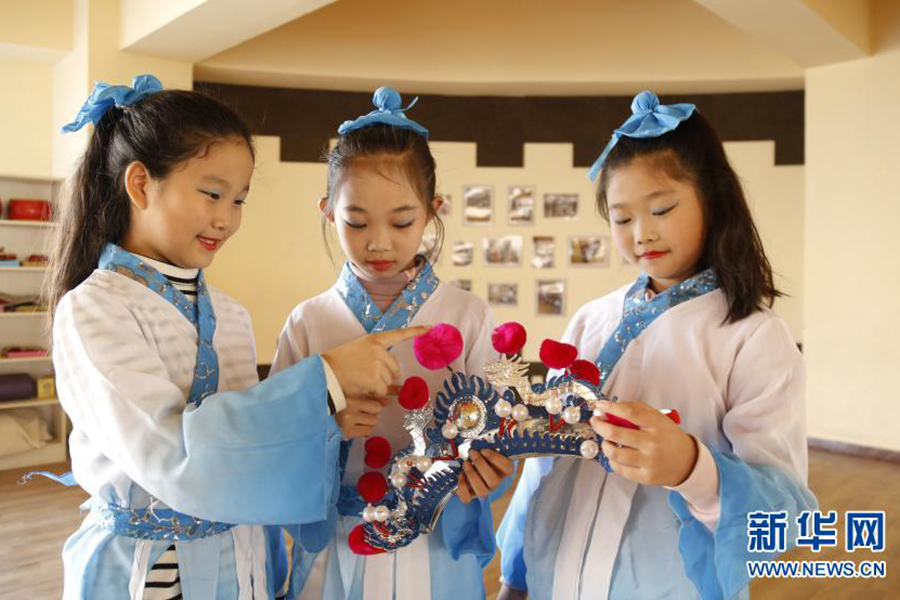 11月19日,在河北省邢臺市家樂園小學,孩子們在了解戲曲頭飾。(新華社發 張馳/攝)