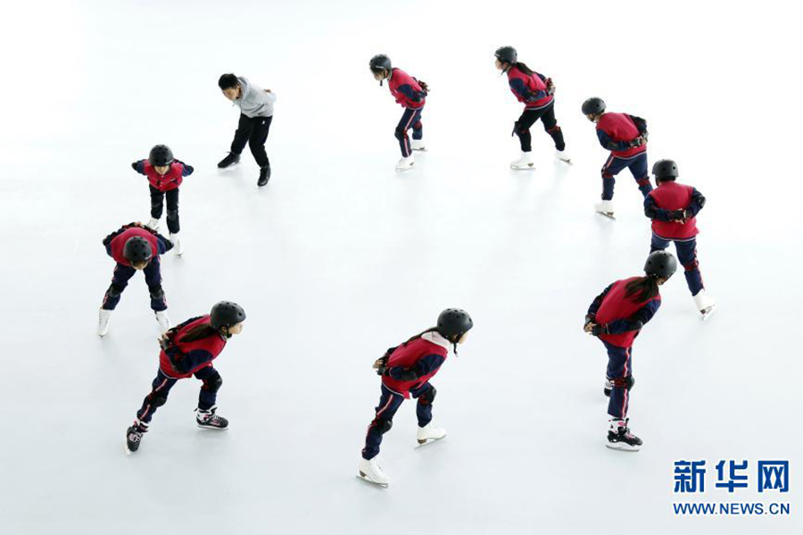 11月24日,邢臺市一所小學的學生在老師的帶領下練習冰上速滑。(新華社發(fā) 張馳/攝)