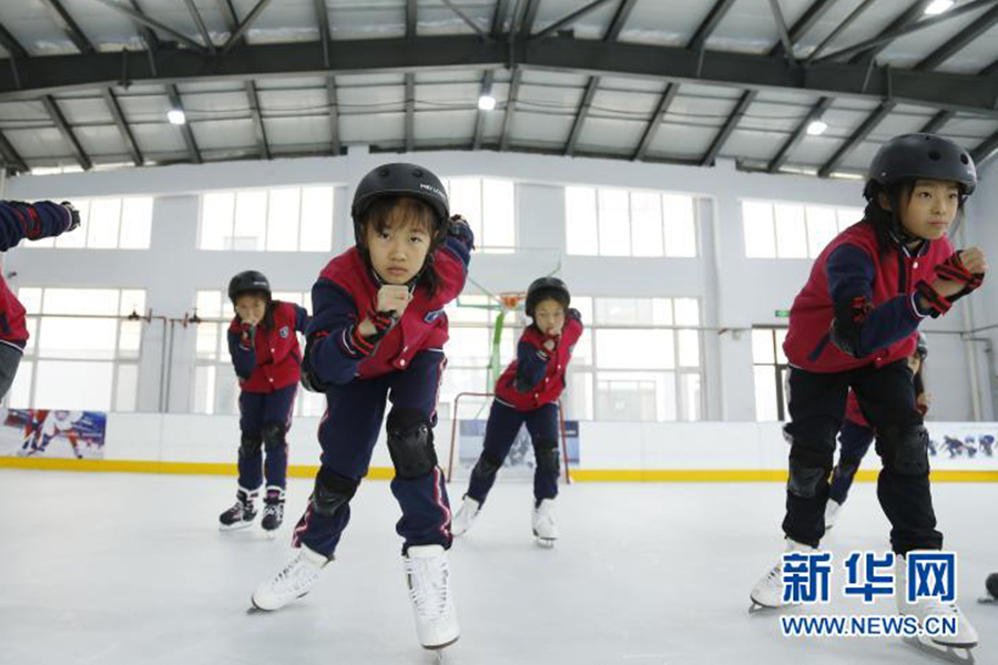11月24日,邢臺市一所小學的學生在練習冰上速滑。(新華社發(fā) 張馳/攝)