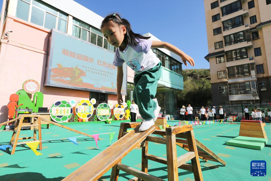9月26日,甘肅省定西市安定區南苑幼兒園的小朋友在進行趣味游戲。(新華社發 王克賢/攝)