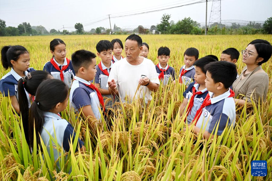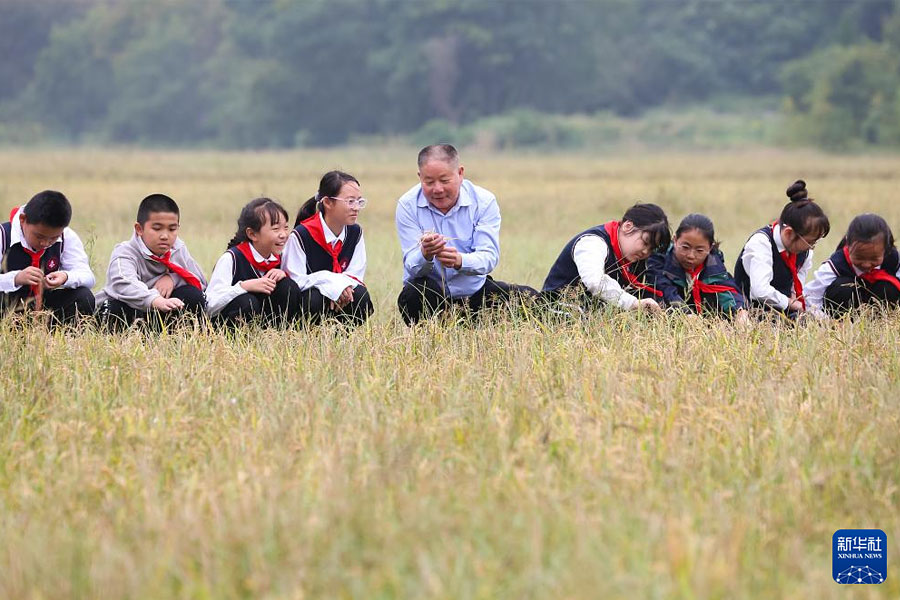 10月16日,山東省臨沂市沂南縣張莊鎮中心小學的學生在老師的帶領下學習水稻知識。當日是世界糧食日,各地開展主題教育活動,增強孩子們愛惜糧食、節約糧食的意識。(新華社發 王彥冰/攝)