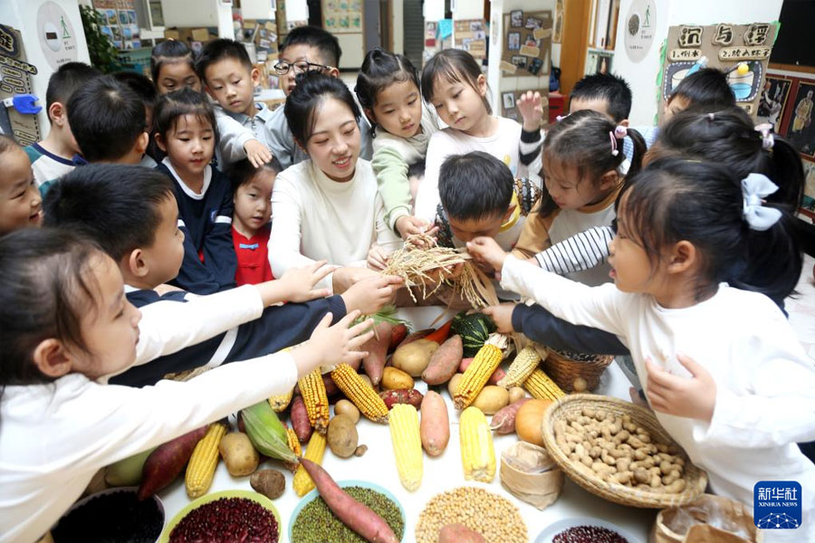 10月16日,在河南省濟源市愚公路幼兒園,老師教小朋友認識糧食。(新華社發 苗秋鬧/攝)