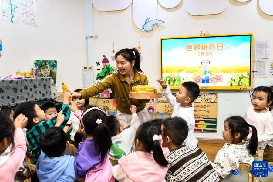10月16日,江蘇省連云港市核電鐘聲幼兒園老師教小朋友辨認糧食。(新華社發 王春/攝)