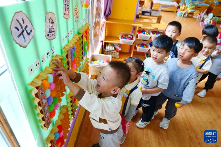 10月16日,山東省濱州市惠民縣淄角鎮實驗幼兒園開展午餐“光盤亮燈”活動,孩子們在午餐光盤后,把一顆象征燈的小球放在空格內。(新華社發 王軍/攝)
