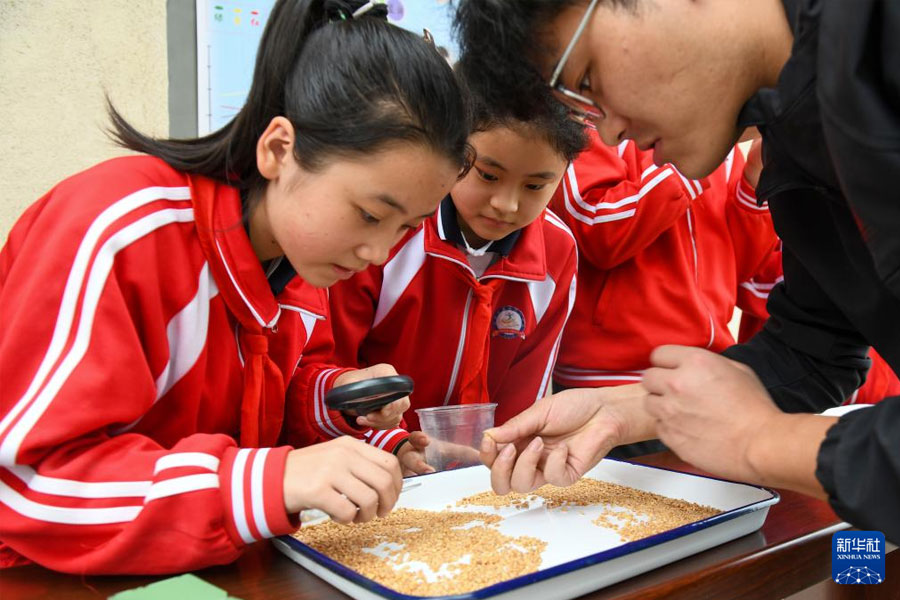 10月16日,在四川省閬中市,小學生在四川省儲備糧集團閬中儲備庫工作人員的指導下學習挑選小麥中的不完善粒。(新華社發 王玉貴/攝)