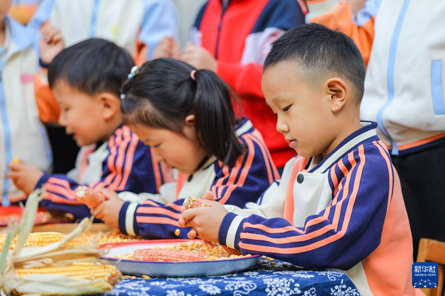 10月16日,在山東省青島市李滄區青峰路幼兒園,小朋友參加搓玉米比賽。(新華社發 張鷹/攝)