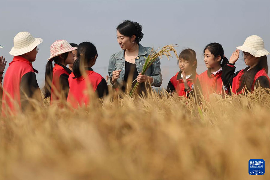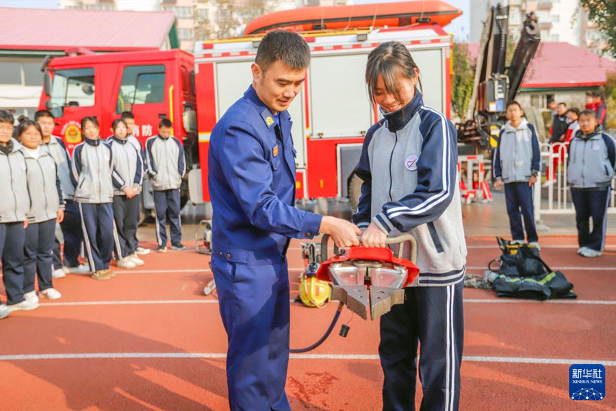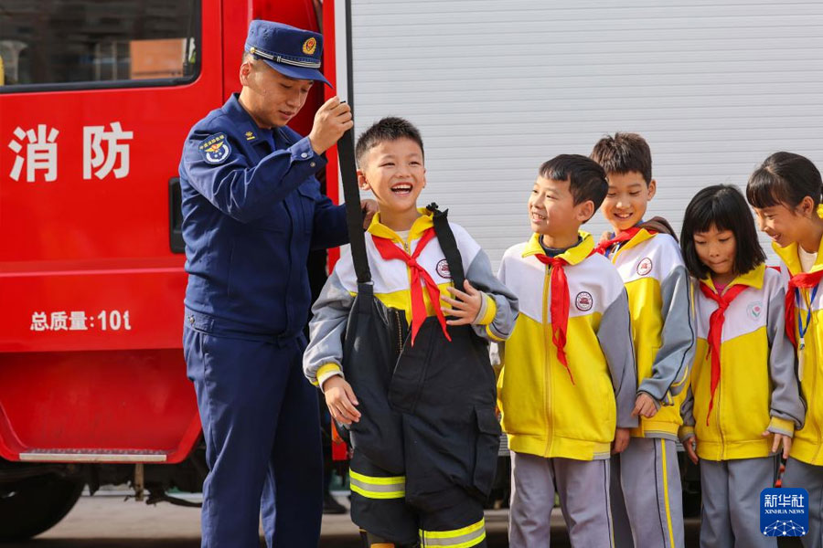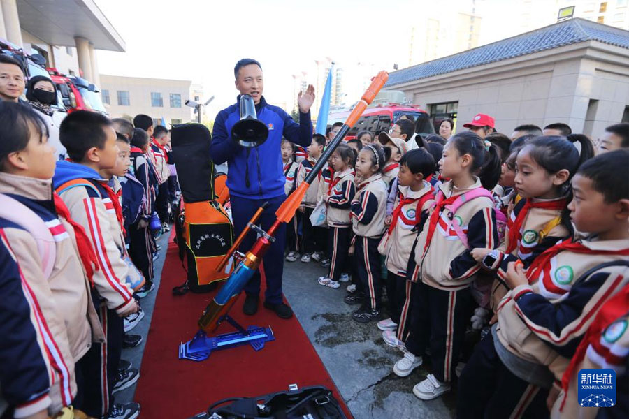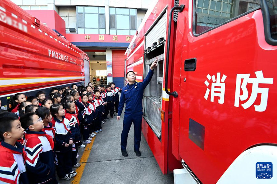 11月5日,河北省邯鄲市消防救援支隊特勤大隊一站的消防員為邯山區趙王小學的同學講解消防安全知識。(新華社發 郝群英/攝)