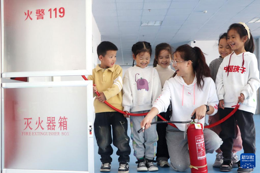 11月8日,在山東省高密市鳳鳴實驗幼兒園,孩子們在老師的指導下了解消防器材的使用方法。(新華社發 李海濤/攝)