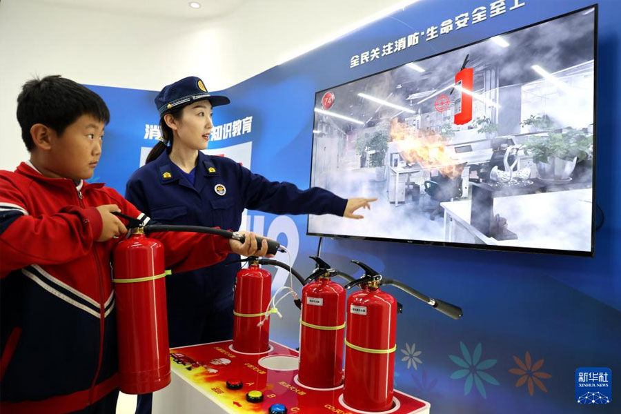 11月8日,在山東省濱州市陽信縣勞店鎮科普教育大廳,小朋友在消防救援隊員的指導下進行模擬滅火訓練。(新華社發 初寶瑞/攝)