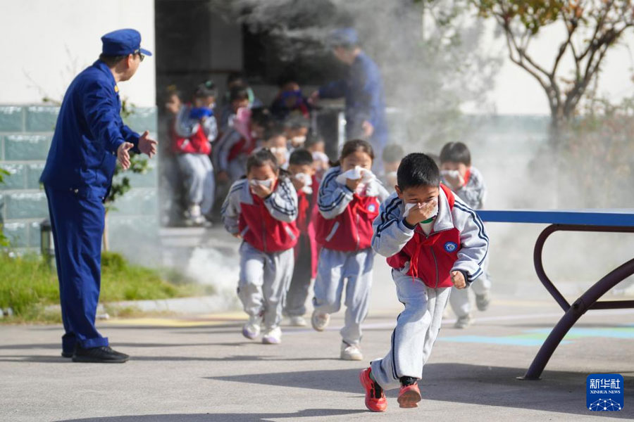11月7日,浙江省湖州市德清縣鐘管鎮干山小學,學生在消防綜合應急救援隊消防員指導下進行應急疏散演練。(新華社發 王正/攝)