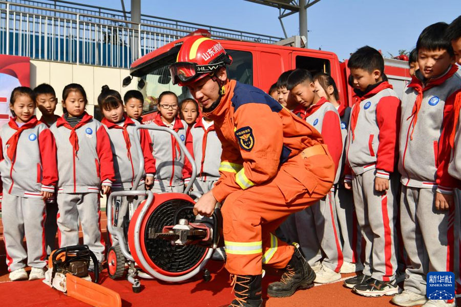 11月7日,在山東省棗莊市臺兒莊區蘭祺實驗小學,消防救援隊員向學生們介紹消防器材功能。(新華社發 賈禮章/攝)