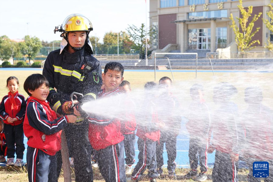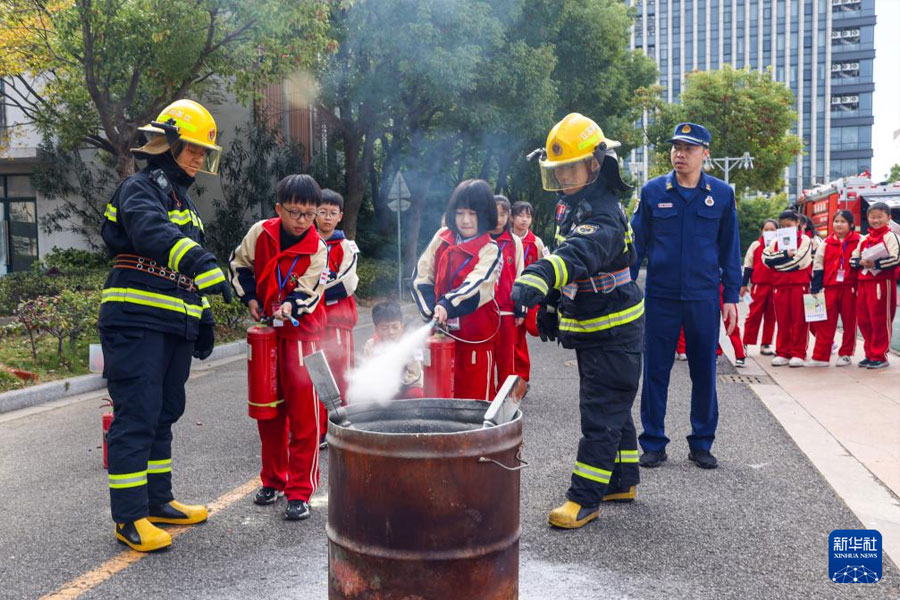 11月8日,在江蘇省揚州市江都區大橋中心小學,學生在江都區消防救援大隊隊員指導下體驗滅火。(新華社發 任飛/攝)