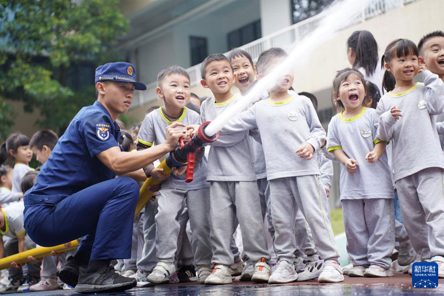 11月5日,在福建省龍巖市新羅區西陂街道一家幼兒園,小朋友在消防員的指導下體驗消防水槍射水。(新華社發 周楊東/攝)