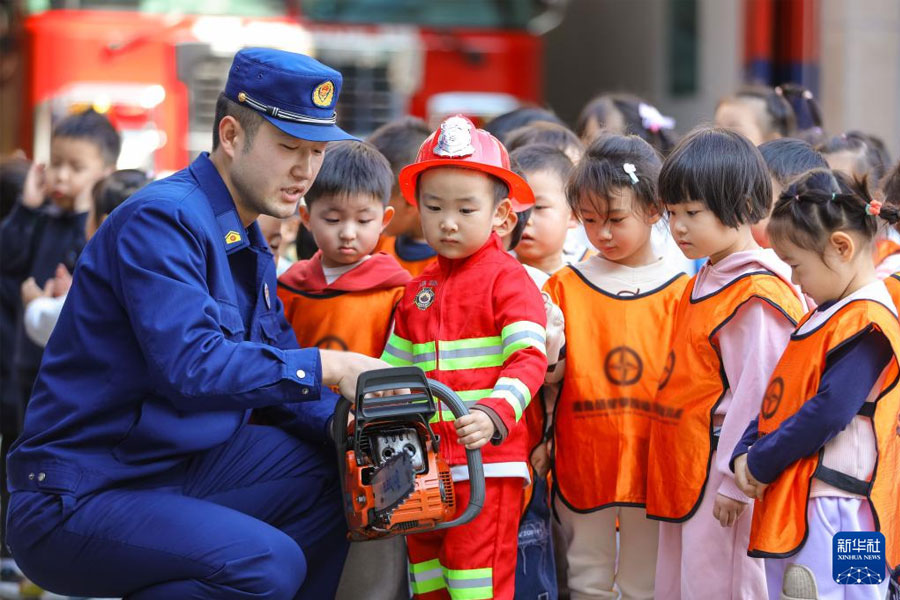 11月8日,在山東省青島市李滄區消防救援大隊李村站,小朋友體驗使用消防救援器材。(新華社發 張鷹/攝)