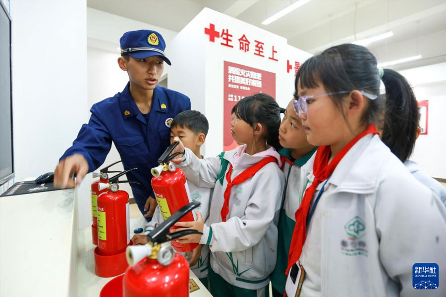 11月8日,在貴州省都勻市第四小學消防體驗館,消防救援人員為同學們普及消防知識。(新華社發 肖偉/攝)