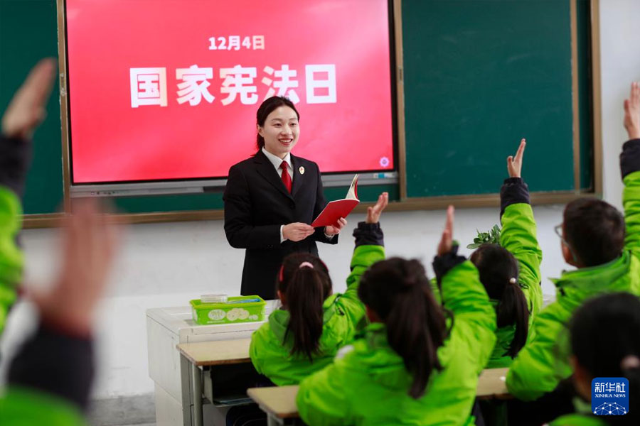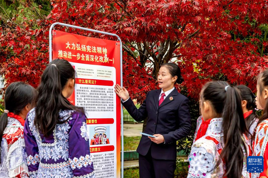 12月3日,貴州省黔西市人民檢察院的檢察干警在新仁苗族鄉化竹小學為學生普及憲法知識。(新華社發 范暉/攝)