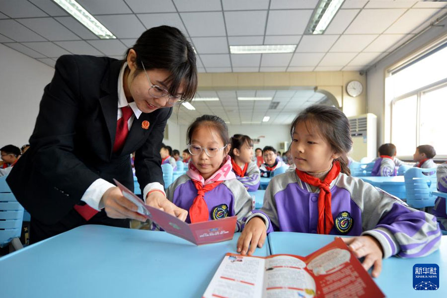 12月3日,在山東青島壽光路小學開展的憲法知識進校園活動上,法官在指導學生學習憲法知識。(新華社發 王海濱/攝)