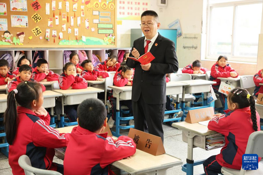 12月3日,在浙江省湖州市德清縣乾元鎮中心小學的模擬法庭上,法官為學生們講解憲法知識。(新華社發 倪立芳/攝)