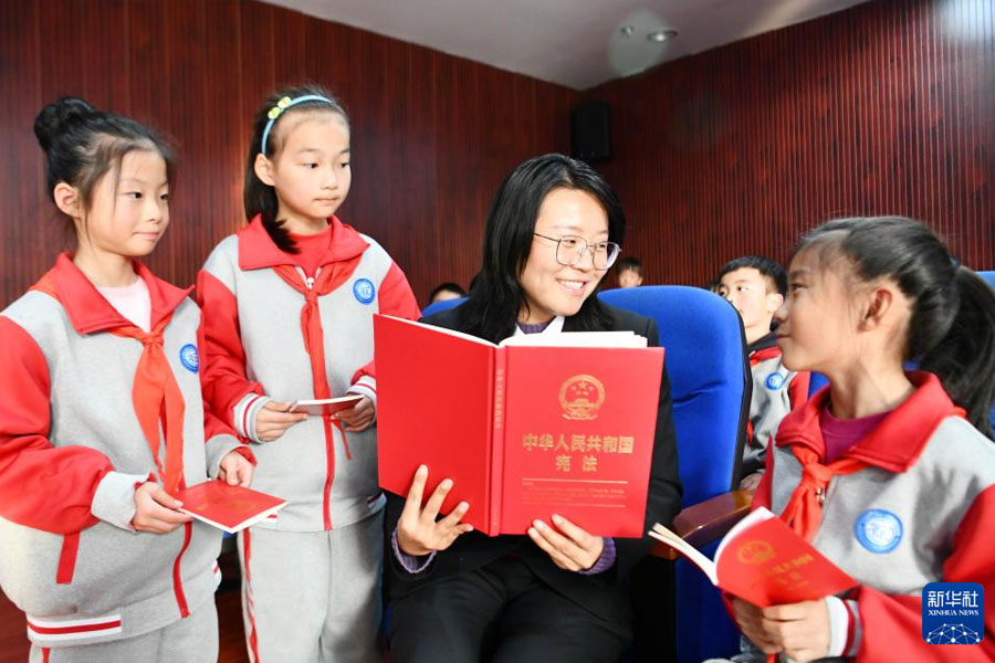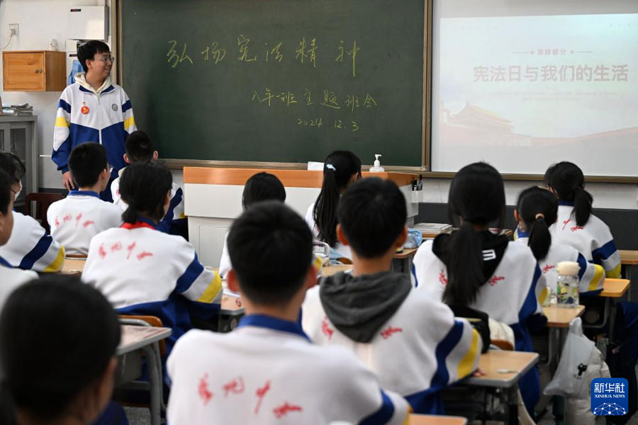 12月3日,天津市人民檢察院第一分院檢察干警向天津市南開區崇化中學學生普及憲法知識。今年12月4日是第十一個國家憲法日,各地開展形式多樣的活動普及憲法知識,宣傳法治觀念。2024年“憲法宣傳周”活動主題為“大力弘揚憲法精神,推動進一步全面深化改革”,時間為12月1日至7日。(新華社記者 趙子碩/攝)
