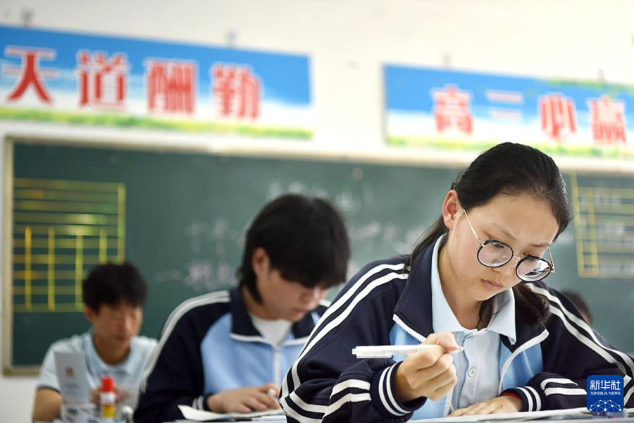 6月4日,河南省焦作市溫縣啟明實驗高中高三學生在課堂上復習備考。2025年高考在即,高三學生正加緊復習。一些學校組織減壓活動,幫助學生放松身心,以輕松、自信的心態迎接高考。(新華社發 徐宏星/攝)