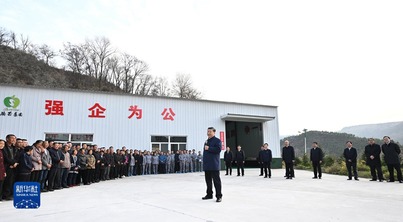 車間外,老鄉們聚集在一起,高聲向總書記問好。習近平同老鄉們拉起家常,回憶當年他在陜北的知青歲月。習近平對老鄉們說,我在陜北生活了7年,當年看到老鄉們生活很艱苦,心里就想著怎么樣讓大家生活好起來。這次來延安,看到一派碩果累累的豐收景象,交通條件大為改善,發生了翻天覆地的變化。過去陜北老鄉們修梯田、種莊稼,面朝黃土背朝天,掄起老鋤頭干活,廣種薄收,十分辛苦,如今山坡上退耕還林種上了蘋果,老鄉們有工作、有穩定收入,孩子有好的教育,老人都有醫保,生活越來越好。從陜北的變化就可以看到中國的變化。習近平指出,現在,“兩個一百年”奮斗目標的第一個百年目標已經實現,絕對貧困問題解決了,老鄉們過上了好日子,但還要繼續努力往前走,讓生活越來越美好。陜北的氣候、光照、緯度、海拔等非常適宜發展蘋果種植,加上滴灌技術、矮化種植技術、選果生產線等不斷發展,就地賣出,銷路不愁,大力發展蘋果種植業可謂天時地利人和,這是最好的、最合適的產業,大有前途。習近平強調,中國共產黨是人民的黨,是為人民服務的黨,共產黨當家就是要為老百姓辦事,把老百姓的事情辦好。空談誤國,實干興邦。要認真學習貫徹黨的二十大精神,全面推進鄉村振興,把富民政策一項一項落實好,加快推進農業農村現代化,讓老鄉們生活越來越紅火。老鄉們爆發出雷鳴般的掌聲。