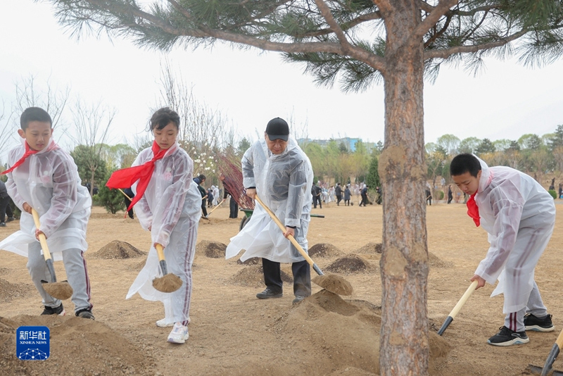 4月4日,黨和國(guó)家領(lǐng)導(dǎo)人習(xí)近平、李強(qiáng)、趙樂(lè)際、王滬寧、蔡奇、丁薛祥、李希、韓正等冒雨來(lái)到北京市朝陽(yáng)區(qū)東壩中心公園參加首都義務(wù)植樹(shù)活動(dòng)。這是習(xí)近平同大家一起植樹(shù)。(新華社記者 謝環(huán)馳/攝)